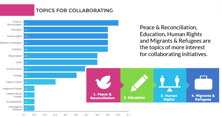 Es curioso, pues en nuestra encuesta global de colaboración del 2017 , habíamos detectado que las temáticas que más ayudan a la colaboración incluyen paz y reconciliación, educación, temas sociales (derechos humanos, migrantes y refugiados, solidaridad, marginalización) y juventud.