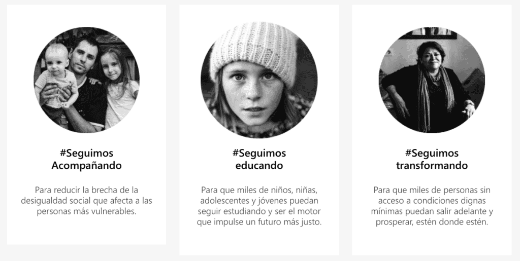 Su objetivo es apoyar los proyectos que ya se han puesto en marcha para atender a la población más vulnerable en tres líneas de acción: ayuda de emergencia (alimentación, salud y vivienda), acompañamiento educativo, psico-social y de inserción laboral, y cooperación internacional en aquellas partes del mundo con menos recursos.